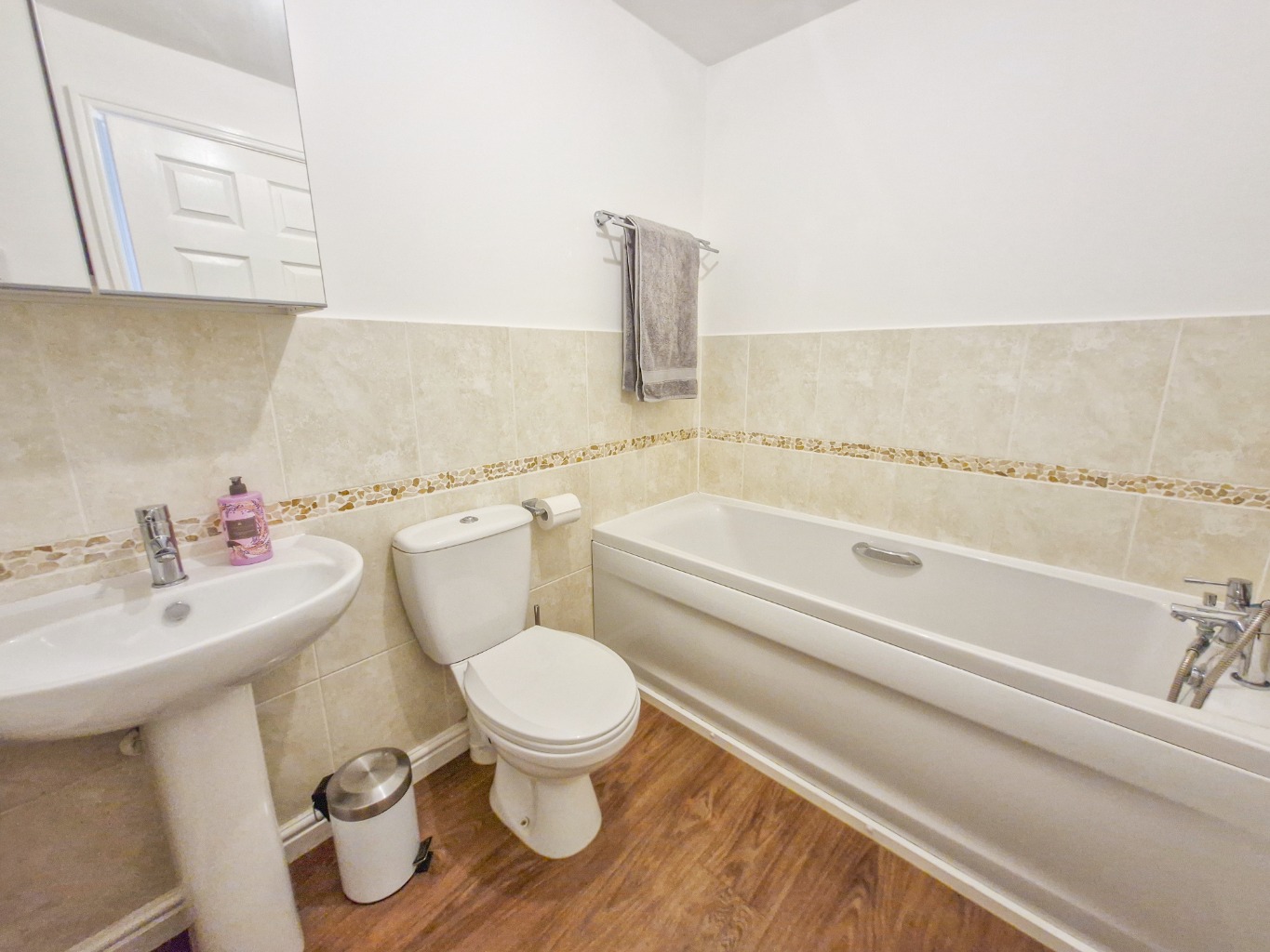 The family bathroom has been completely replaced with a fresh, modern suite and includes a shower over the bath, stylish vinyl flooring and neutral tiling – all finished to a high standard.