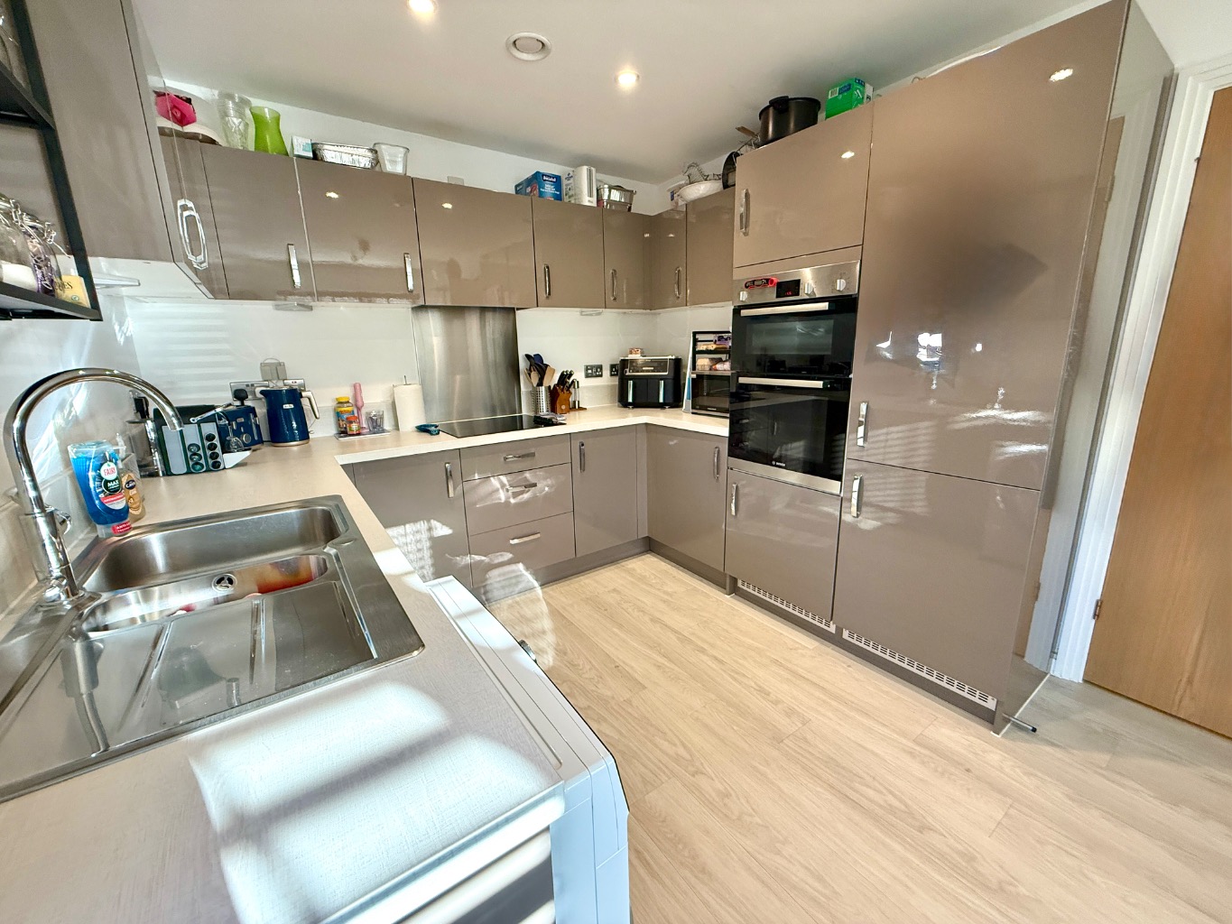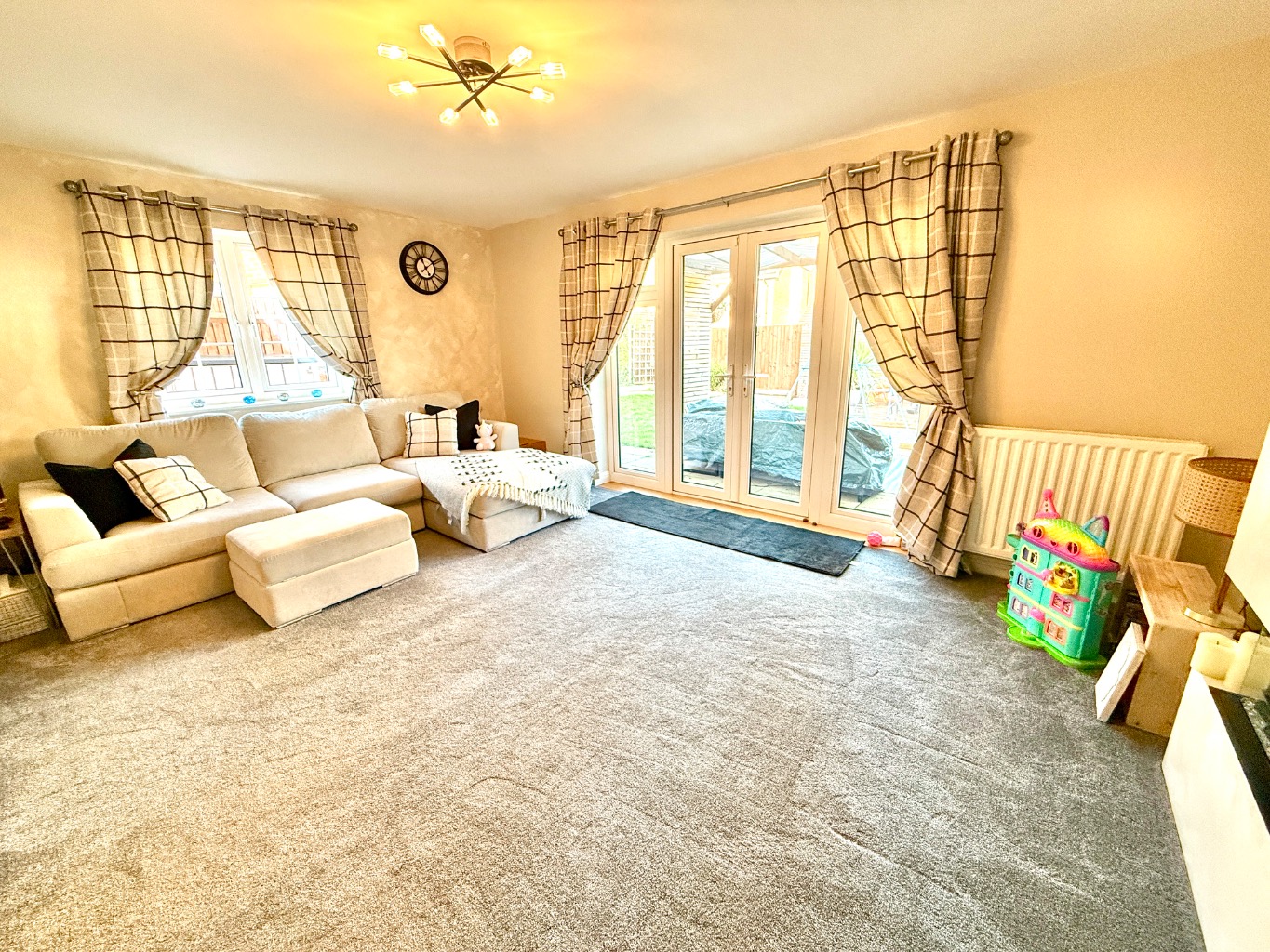 The modern kitchen has integrated appliances and numerous fitted cupboards. For those who love to cook, there is plenty of worktop space for food prep. The lounge/diner is not only a very generous size but benefits from French doors that open on to the secluded rear garden and patio area. The French doors, in addition to the large window to either side, ensures that the room can be bathed in natural light.