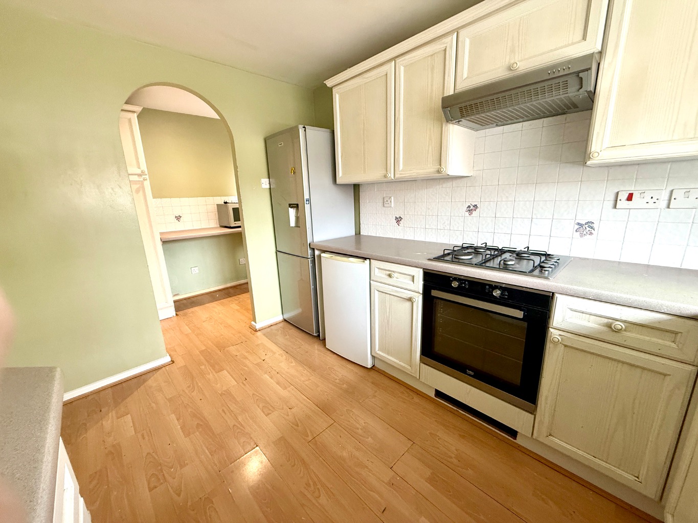 The refurbished kitchen is a delight, featuring ample storage space, space for appliances, and a charming breakfast area. Adjacent to the kitchen, you’ll find a separate dining room, providing a perfect setting for family meals or dinner parties.