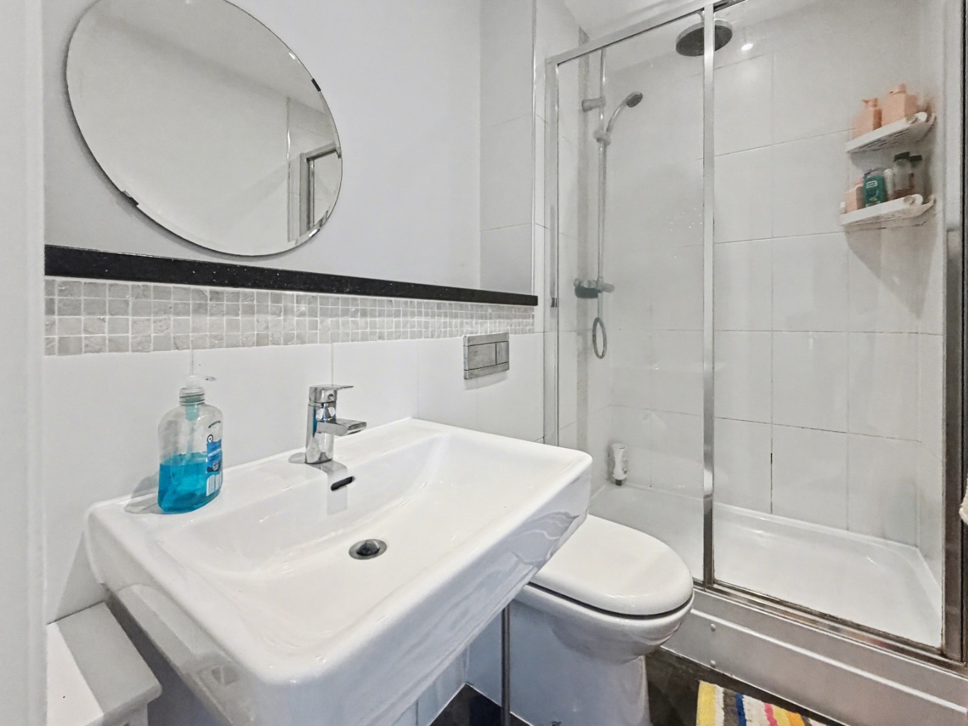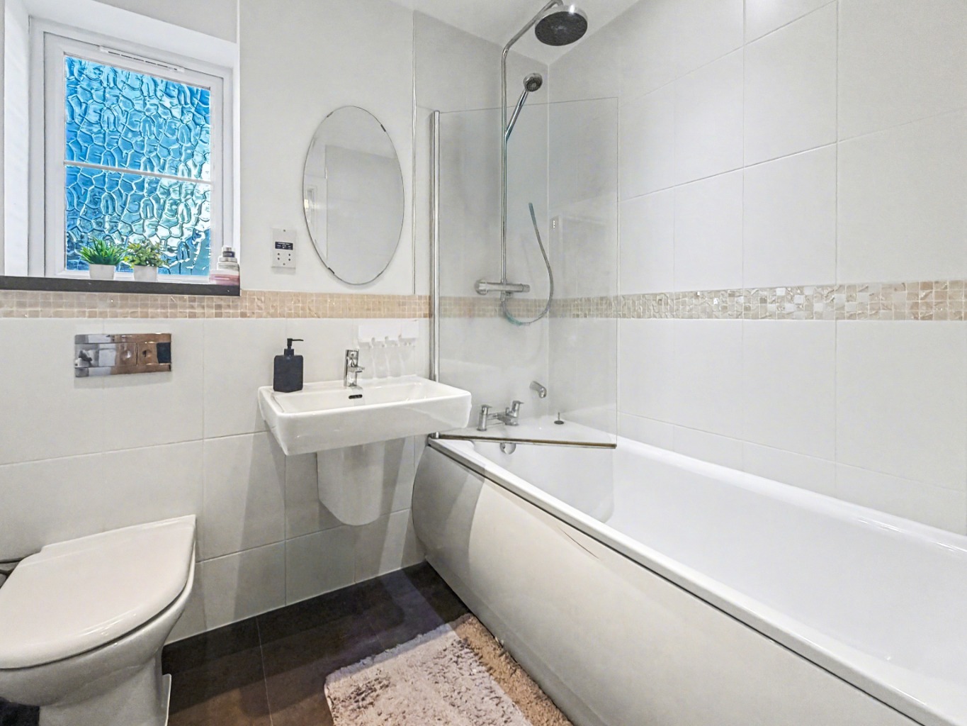 The family bathroom is finished with a modern suite and has a shower over the bath, perfect for busy mornings or a relaxing soak at the end of the day.