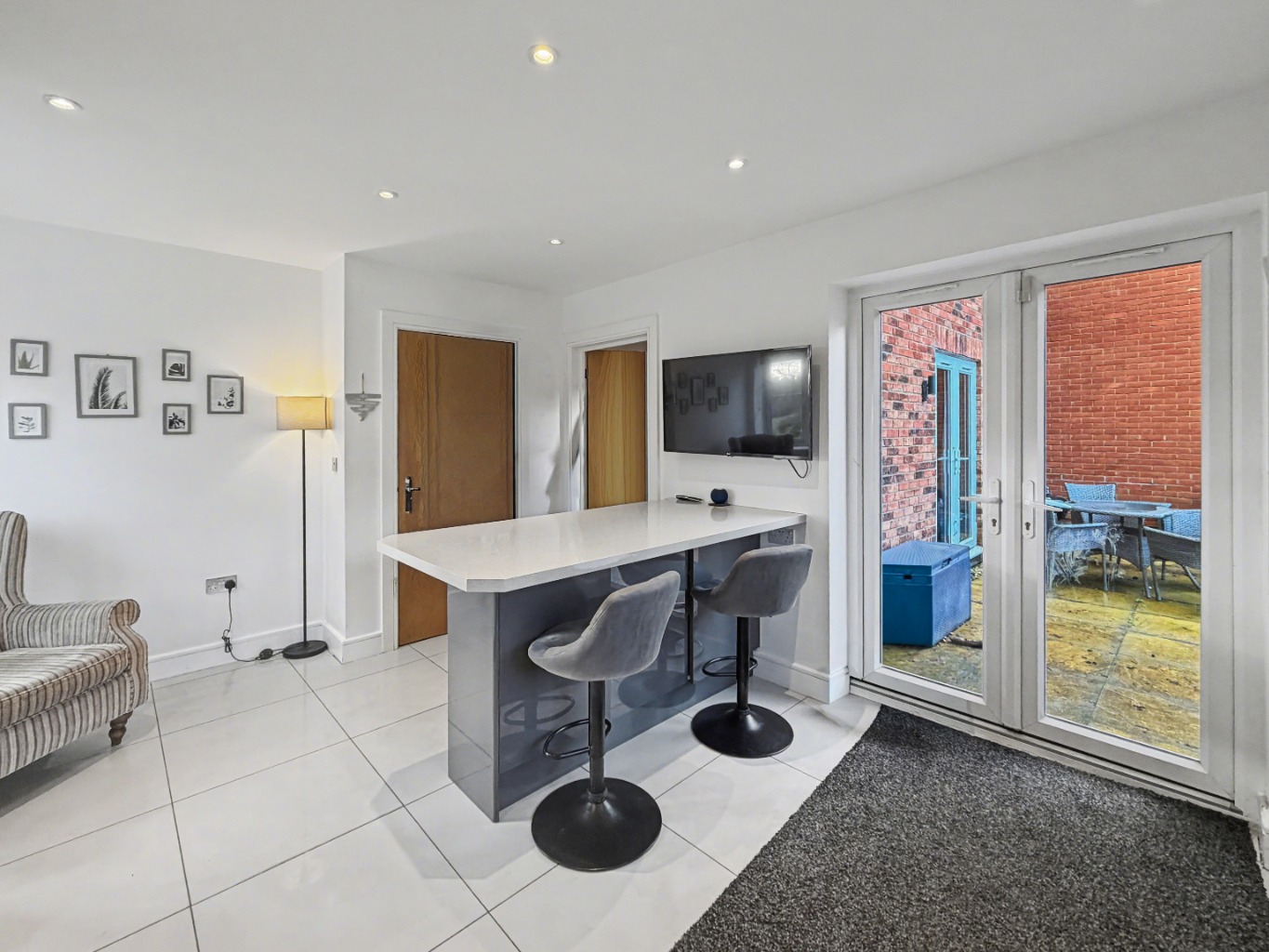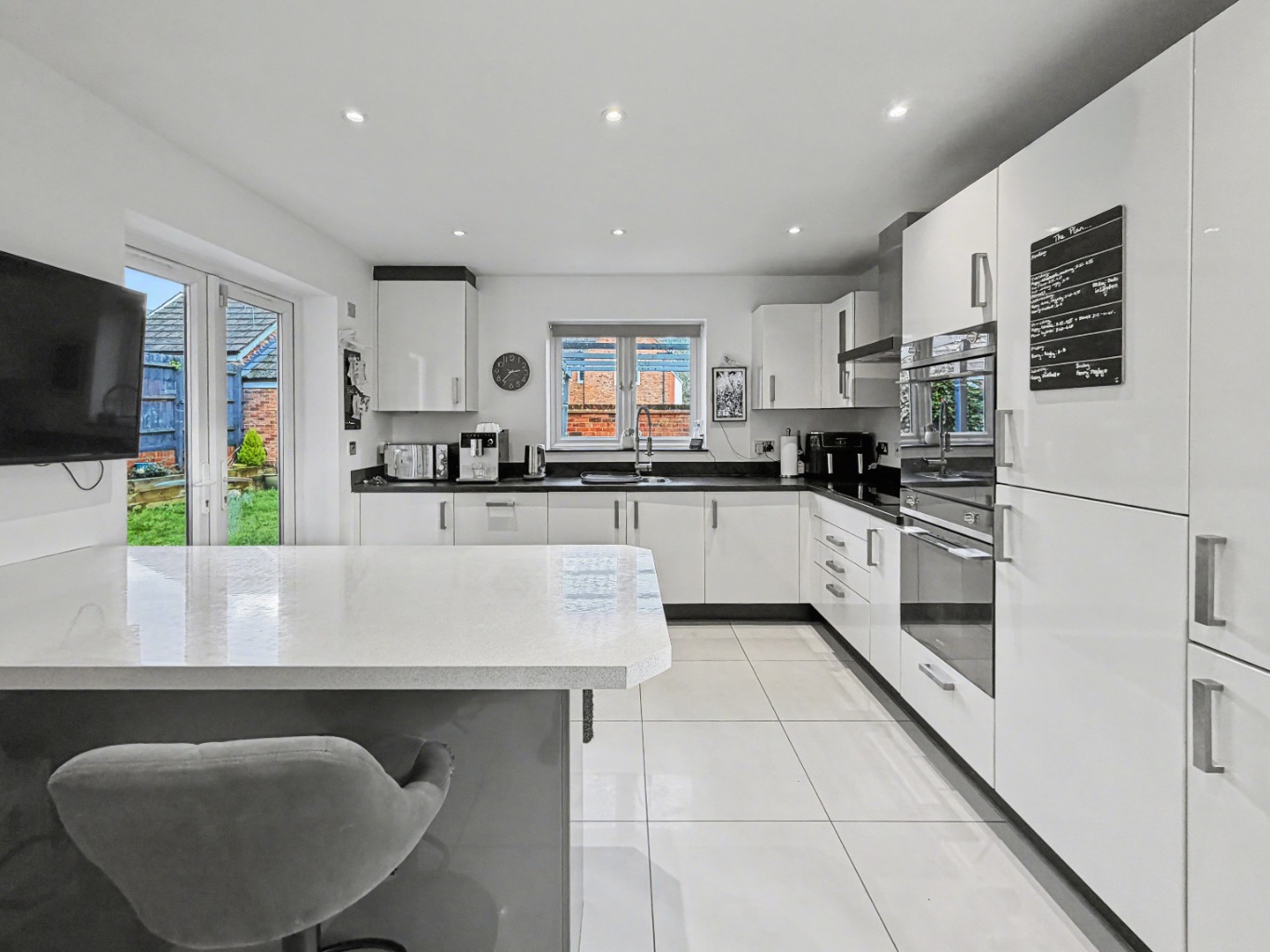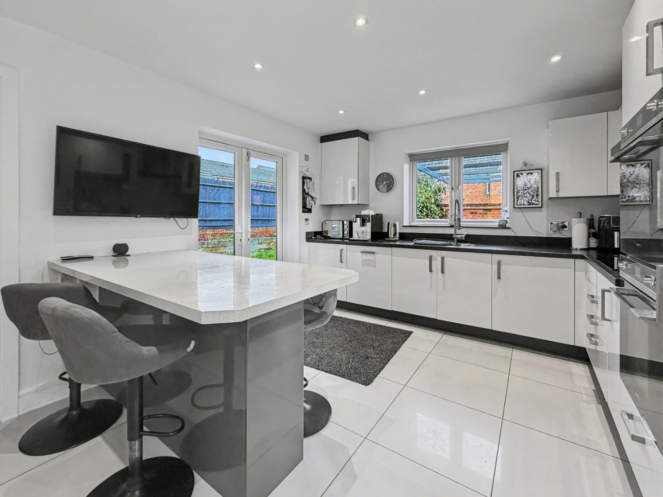 At the heart of the home is the kitchen/diner – a bright, sociable space with windows to two sides and French doors opening out to the garden. With a central island and breakfast bar, it’s easy to imagine chatting to family or friends while dinner’s on, keeping an eye on homework, or simply enjoying a relaxed coffee in the morning. There’s also plenty of room for a breakfast table… and even a small sofa if you wanted to create a real family hub.
