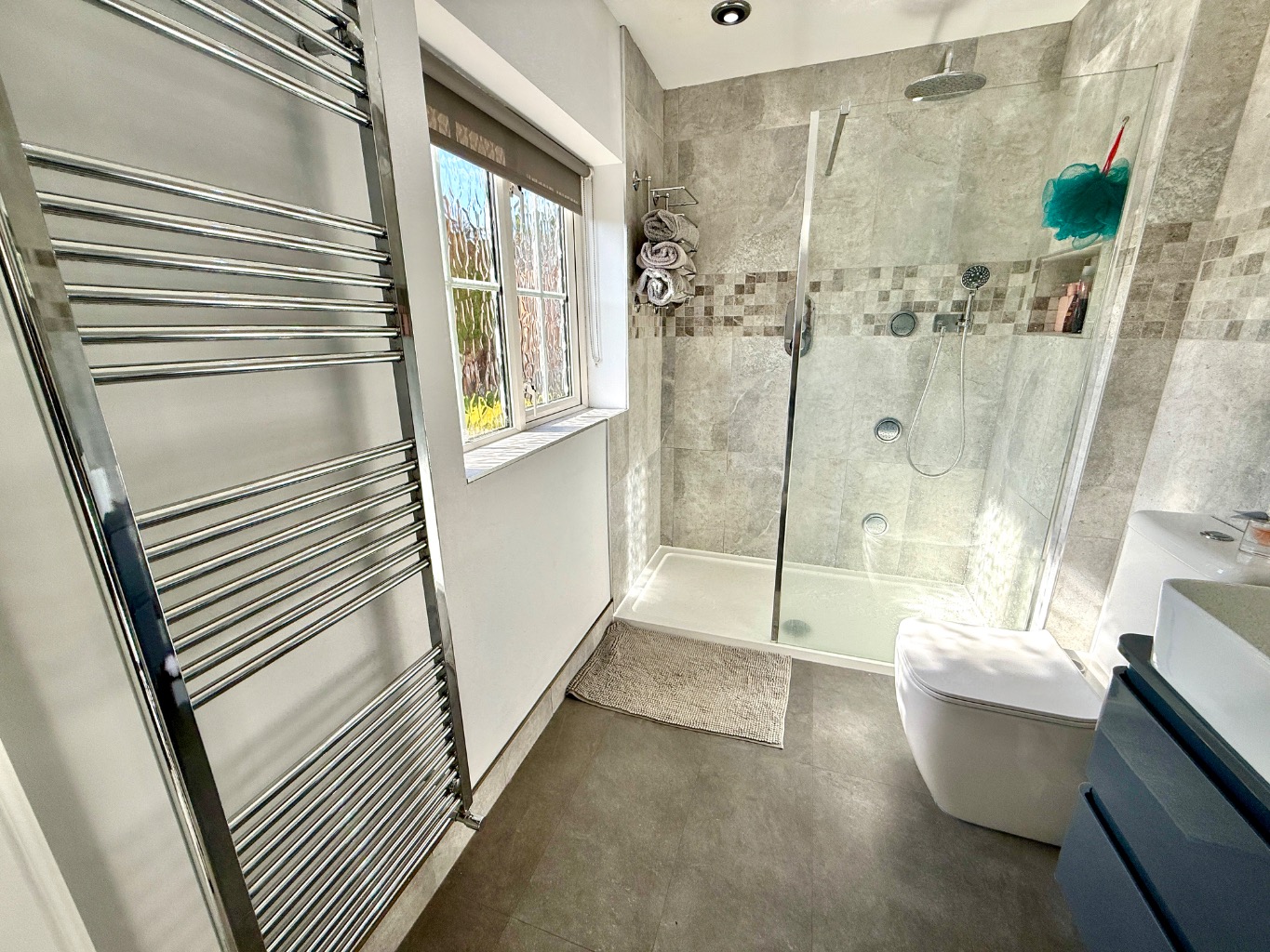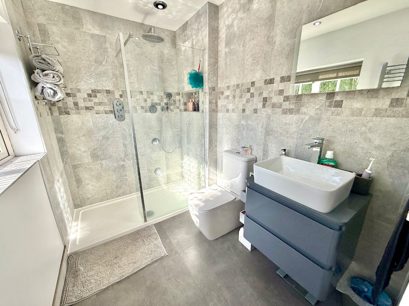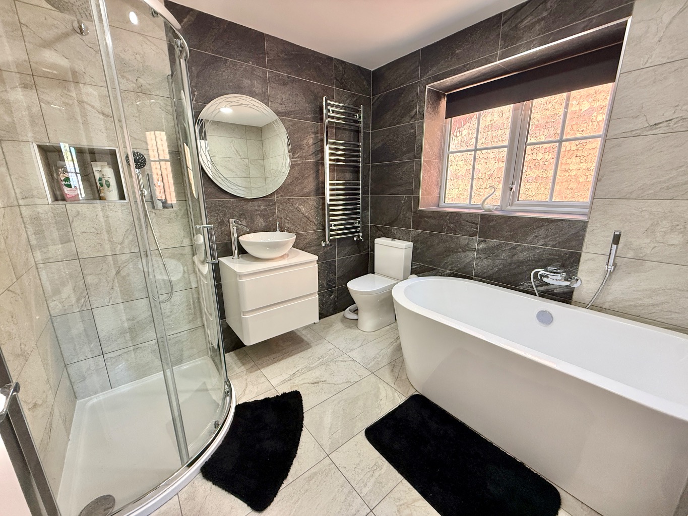 To the first floor there are four great-sized bedrooms. The main bedroom has a replaced modern en-suite bathroom and fitted wardrobes. Bedrooms two and three also benefit from fitted wardrobes. You will also find a replaced family bathroom, very contemporary – consisting of a bath with shower over, sink and low level WC.