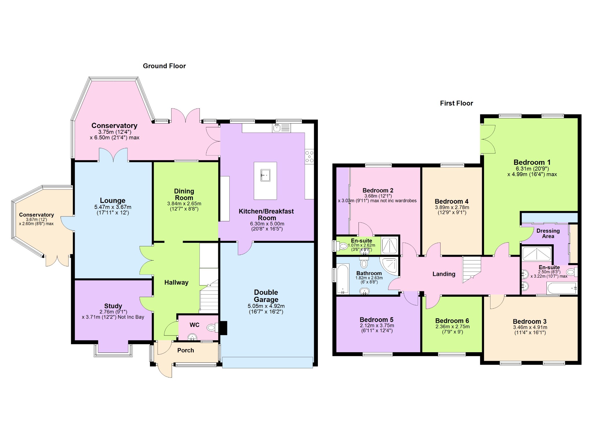 Upstairs you will find six spacious bedrooms, providing ample space for the whole family. The master bedroom features an en-suite and a walk-in dressing area, offering both privacy and convenience. Additionally, the second bedroom also includes an en-suite and fitted wardrobes, providing the perfect haven for guests or older children.