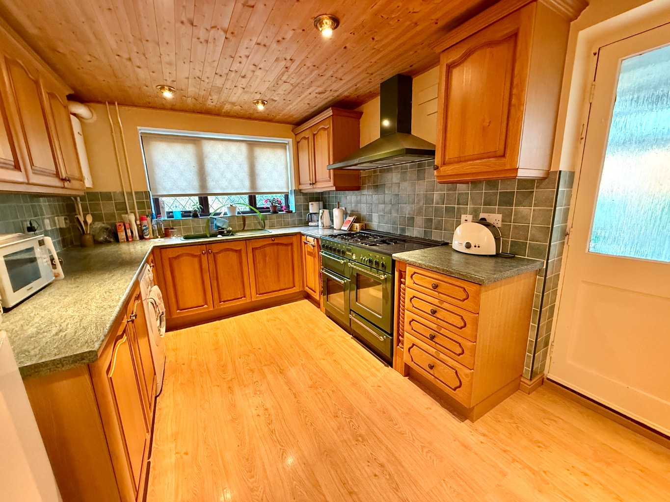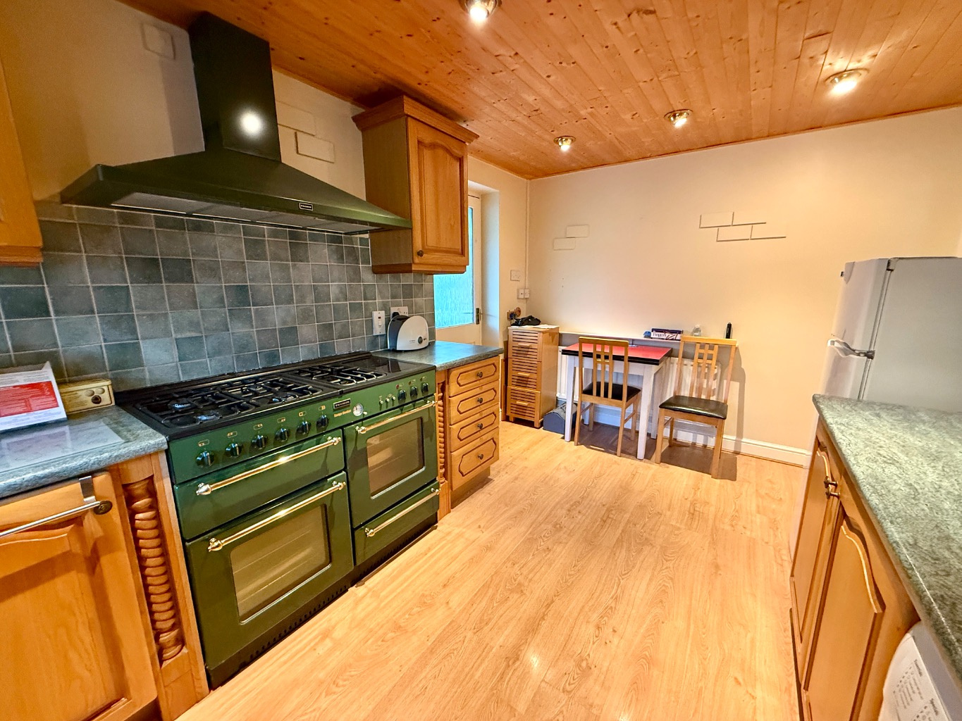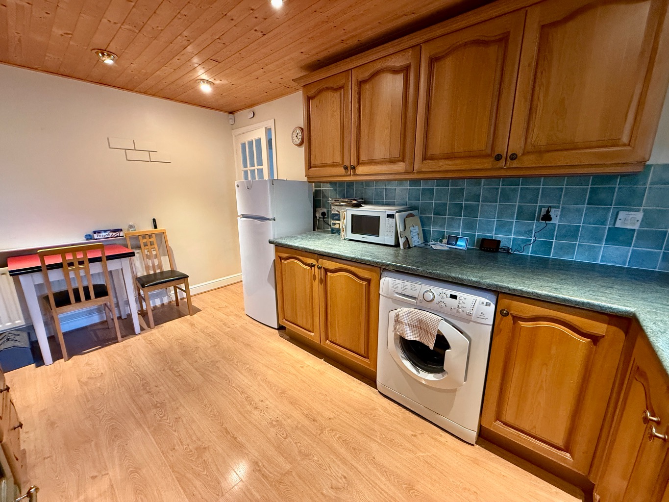 The fitted kitchen area which has been thoughtfully designed, offers a practical and efficient space, with plenty of room for white goods and even a small table and chairs, it also presents an opportunity for a buyer to personalise and upgrade to their own taste, additionally, a small glazed lean-to provides further versatile space, perhaps for storage or a utility area.