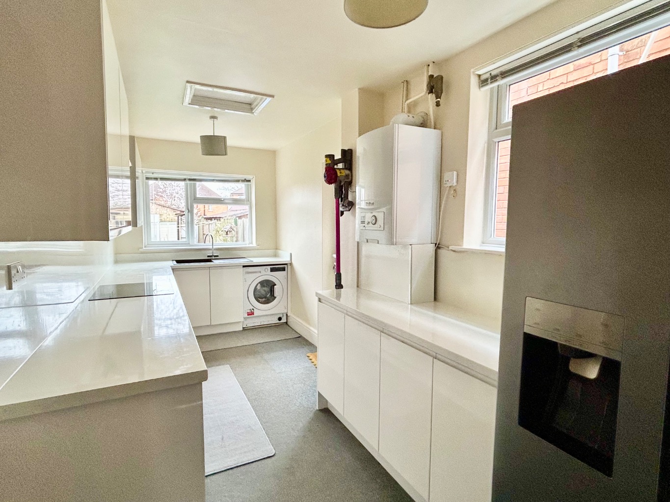 The kitchen was extended many years ago but has been refitted in more recent years with modern white units with soft-closing doors and drawers and a number of integrated appliances built in. The worksurfaces and splashbacks are of a complimenting neutral pallet that create a lovely streamline look. The sink overlooks the garden so it’s easy to keep an eye on the kids.