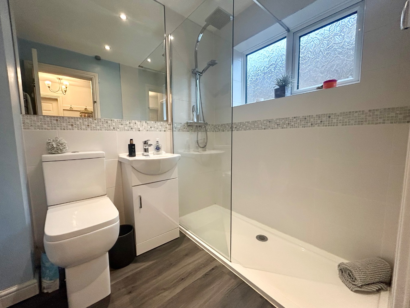 The bathroom has been upgraded in recent years to create a modern shower room, finished in a smart, contemporary style with a window providing natural light and ventilation.