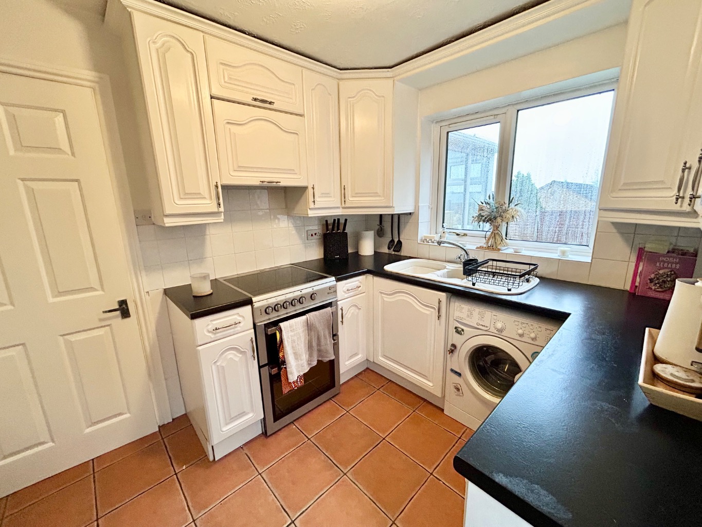 The kitchen sits just off the living space and, while a little dated maybe now, is clean, tidy and perfectly usable. It offers good storage and worktop space and looks out to the rear, making it a pleasant room to spend time in until any future plans are made.