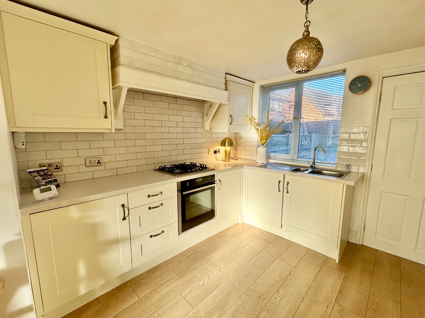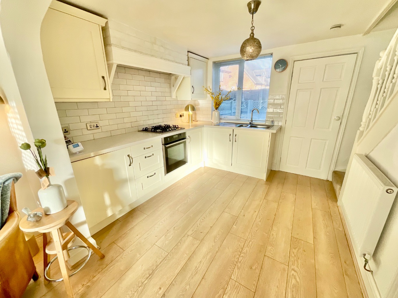 An archway leads you through to the Shaker style Kitchen which has plenty of units and a number of built in appliances, as well as an understairs storage cupboard.