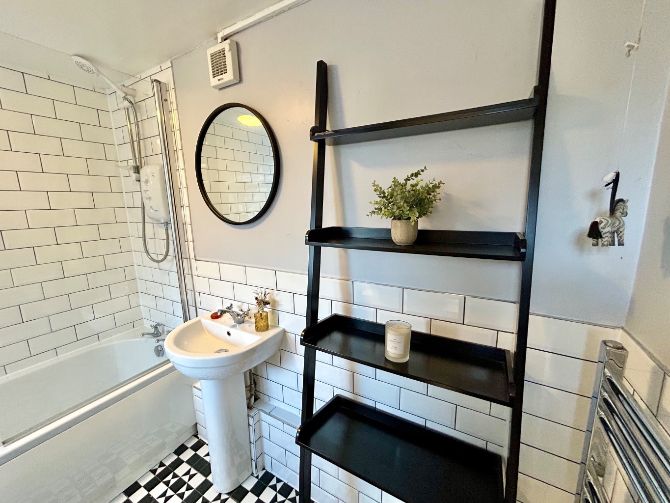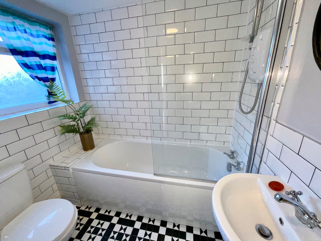 The bathroom has a modern white suite with a shower over the bath and is complimented by black and white tiling to the floor and metro style tiling to the walls.